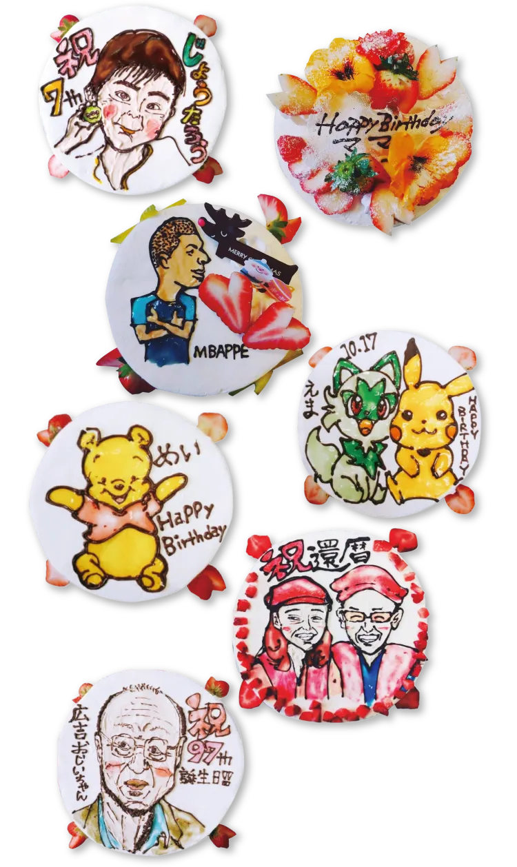 お誕生日、還暦、古希、喜寿、傘寿、米寿、卒寿、白寿、百歳のお祝い、端午の節句、桃の節句、七五三、お子様のお祝いごとに、似顔絵やキャラクターケーキも大人気です。